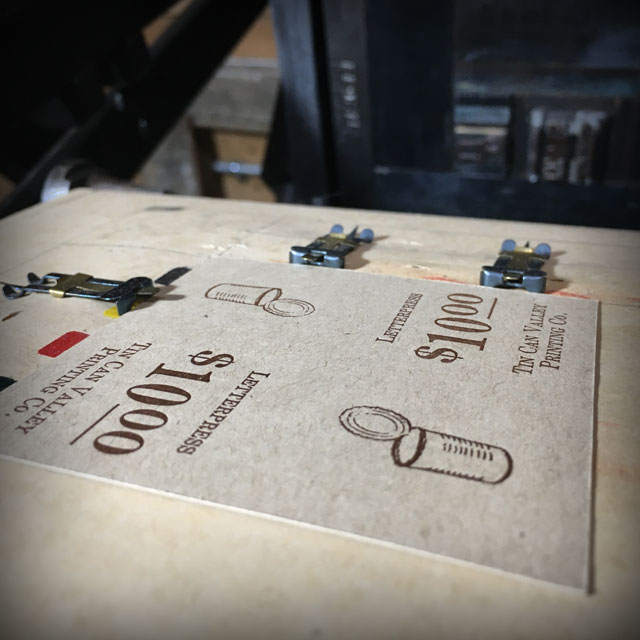 The finished size of these tags is 1.5″ square. If this job were done digitally or on an offset press, the image would be repeated as many times as could be fit on the largest sheet size available, then trimmed. And since this is hand-set type and the press-run is only a couple-hundred, I only needed to print this one-up.