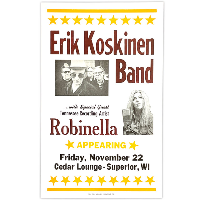 I saw Erik Koskinen for the first time in 2018 at the Hook & Ladder in Minneapolis. I saw him again two weeks later at Pleasant Grove Pizza Farm. I asked him if I could make some posters for the band. He said, “Sure. Make me something.” Meanwhile seven years later…