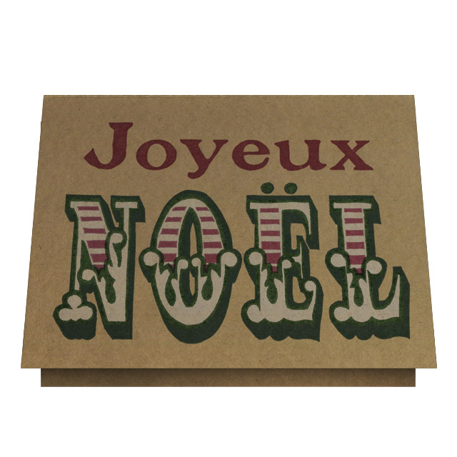 Greeting card on French Paper Co. Brown Box. “Joyuex” printed from antique foundry type. “NOEL” is printed from three hand-carved linoleum blocks.