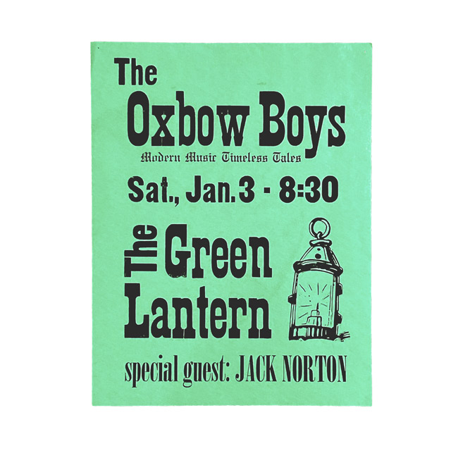 From an Oxbow Boys gig at The Green Lantern coffee house in Winona, Minnesota (probably 2004). Printed on a Triumph proof press with wood and metal type and a hand-carved wood block.
