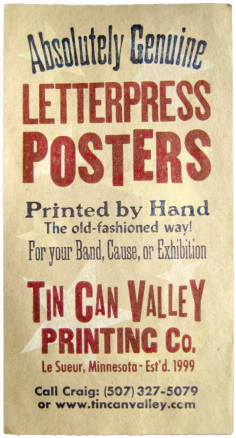 Tin Can Valley promotional poster. Really just a big business card. Hundreds have been handed out. Only a few remain. Printed in four colors on 40 lb. kraft paper. Definitely…